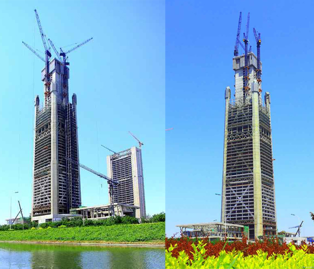 由中建三局承建的天津高銀117大廈工程采用了中昇建機(jī)ZSL2700(2臺(tái))、ZSL1250(2臺(tái))共4臺(tái)塔機(jī),吊裝順利進(jìn)行!ZSL2700在世界高層鋼結(jié)構(gòu)建設(shè)中,屬超大型的內(nèi)爬式動(dòng)臂塔式起重機(jī)。ZSL2700采用柴油發(fā)動(dòng)機(jī)引擎驅(qū)動(dòng),該塔機(jī)最大工作幅度為65m,而在27m吊裝幅度范圍內(nèi)可吊重達(dá)100t,最大起升高度達(dá)597m,起升速度達(dá)110m/min。其吊裝性能和技術(shù)水平在國(guó)內(nèi)處于領(lǐng)先地位!